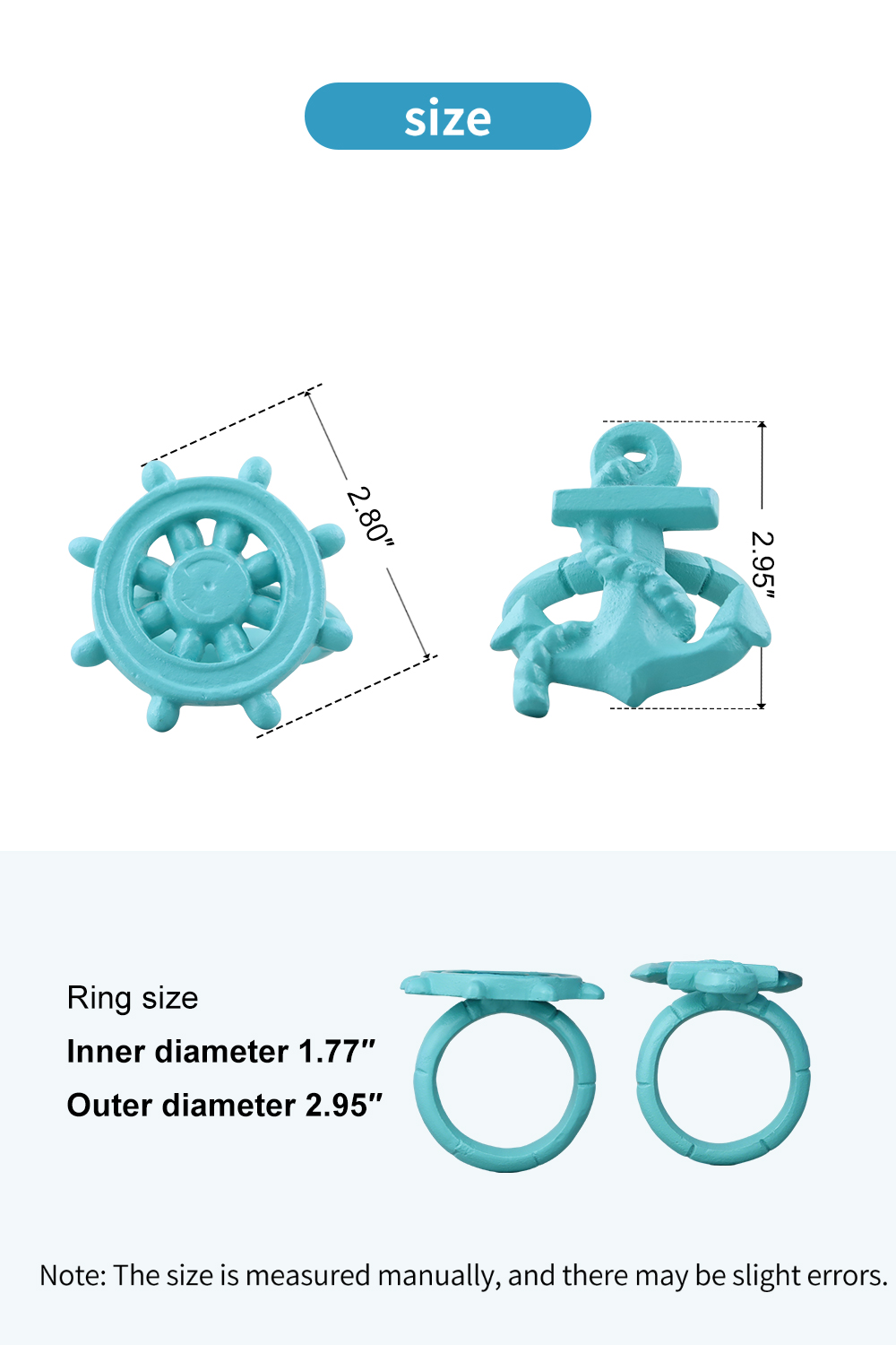 • Made from premium cast iron, these durable and reusable napkin rings are designed to fit all types of napkins, elevating your table with timeless elegance. Slide a folded or rolled napkin through the ring for an effortless yet sophisticated touch. To maintain their quality, wipe clean with a soft cloth and store in a dry place. Each set includes one anchor-shaped napkin ring (2.95″L × 2.44″W) and one rudder-shaped napkin ring (2.8″diameter), both with an inner diameter of 1.77″and an outer diameter of 2.95″ to fit most napkins with ease.