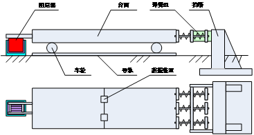 機械式單向水平正弦振動臺原理圖如圖1所示,臺面為一臺火車皮,上有10cm厚的鋼筋混凝土作上臺面,尺寸為12×3.3m,自重20噸,可載重20噸的試件。臺面由兩對車輪支承導向,車輪在導軌上滾動。臺體一端有彈簧組連到擋墻上,另一端連有摩擦阻尼器。臺體中間為起振裝置,由兩組偏心輪組成,產生單向激振力,見圖2。起振裝置有兩組傘形齒輪換向,用95馬力的解放牌汽車發(fā)動機驅動。最大出力40噸,最高頻率40Hz。