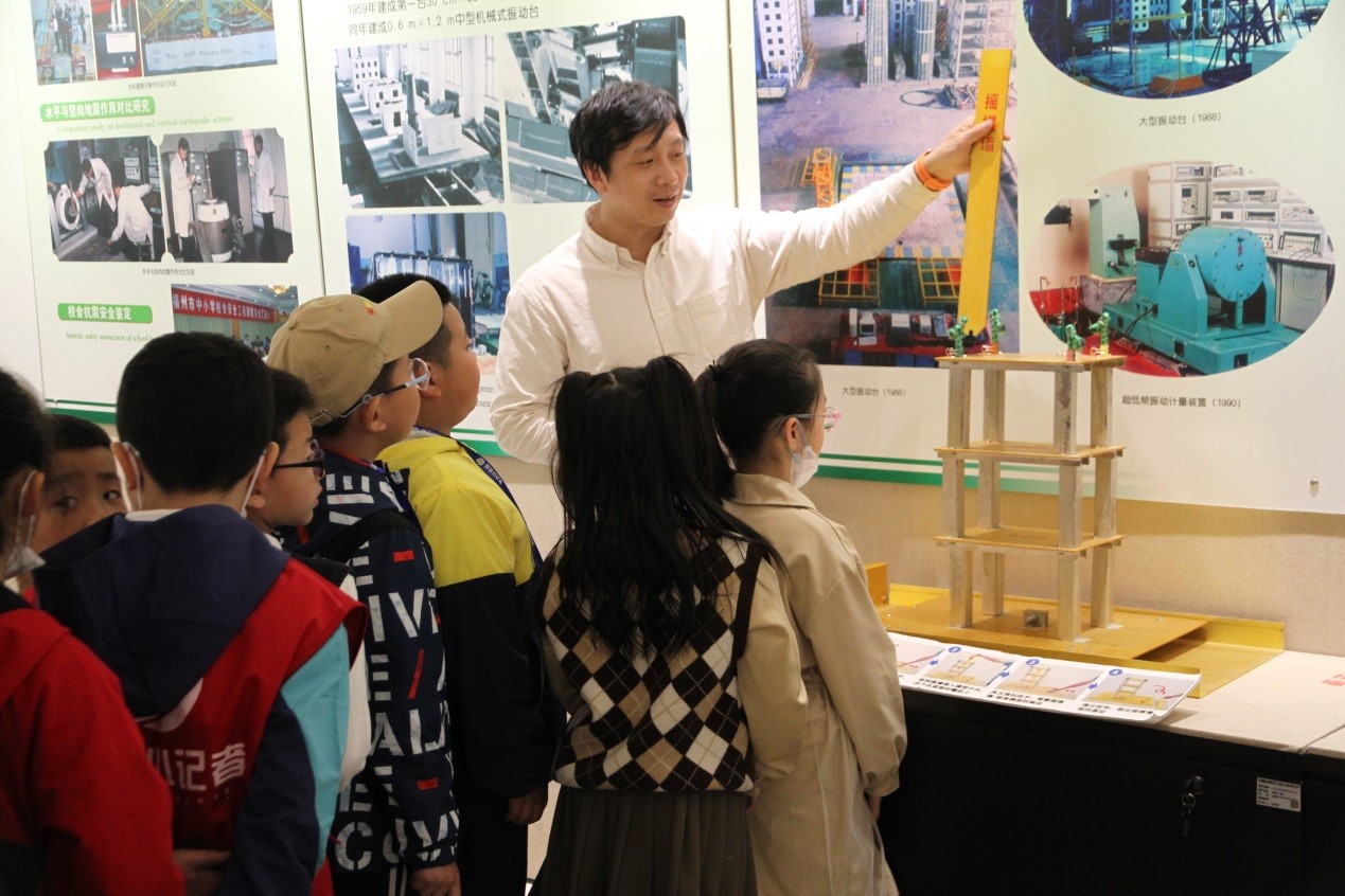 講座結(jié)束后,張昊宇副研究員帶領(lǐng)小記者們參觀并實踐了一系列的科普實驗。來到鐵路地震監(jiān)測預(yù)警系統(tǒng)展臺,了解地震后該系統(tǒng)如何保障高鐵安全運行的原理。通過學(xué)習(xí)和思考,小記者們提出許多問題,例如“中國古建筑為何能夠跨越千年不倒”,張昊宇結(jié)合提問講解了中國傳統(tǒng)木結(jié)構(gòu)的抗震機理知識。最受小記者們歡迎的還是微型振動臺模擬實驗和搖擺墻結(jié)構(gòu)無損倒塌模型實驗。每一位小記者都親手操作搖擺墻結(jié)構(gòu)無損倒塌模型,近距離直觀地認(rèn)識到不同建筑結(jié)構(gòu)抗震能力的強弱區(qū)別,學(xué)習(xí)了建筑結(jié)構(gòu)抗震的基本知識。
