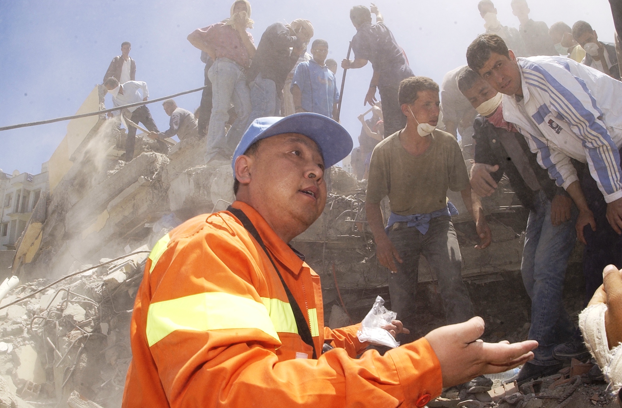 發布時間: 2023-08-02 點擊數量:5481走進位于哈爾濱市南崗區的中國地震局工程力學研究所(簡稱“工力所”),文化墻上的一幅照片格外引人注目:震后的斷壁殘垣間,深膚色卷頭發的救援人員圍住一位中國專家,他身穿橘黃色國際救援隊服,正全神貫注地講解著。這是工力所二級研究員、博士生導師孫柏濤,作為中國國際救援隊專家參與指導2003年阿爾及利亞地震現場救援的場景。