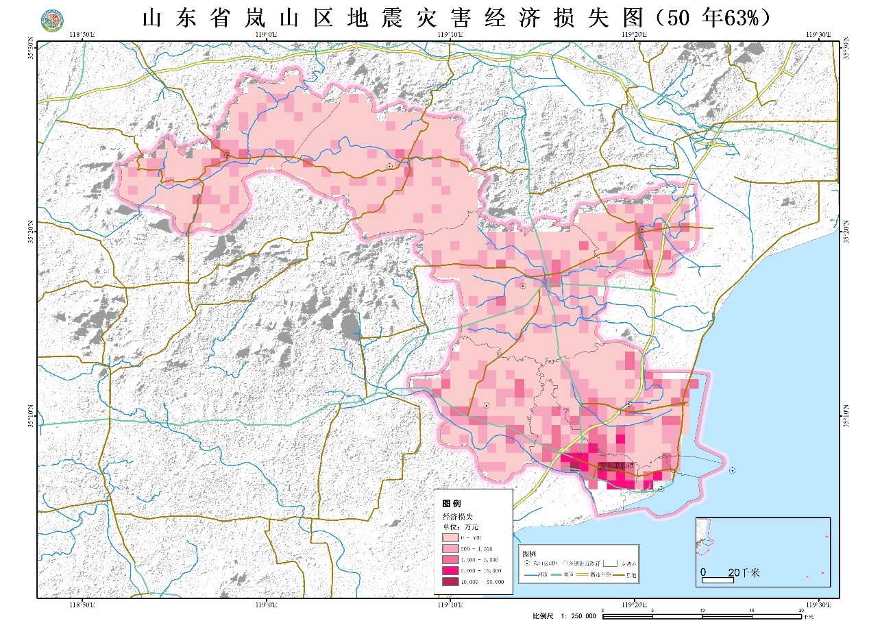 圖1 山東省日照市嵐山區(qū)地震災(zāi)害經(jīng)濟(jì)損失風(fēng)險(xiǎn)圖(50年超越概率63%)