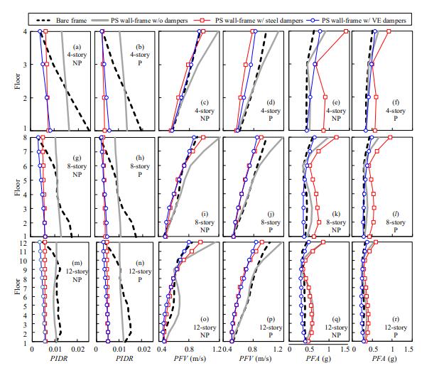 本文通過非線性時程分析和多維地震易損性分析,研究了兩種阻尼器(即摩擦型阻尼器和黏彈性阻尼器)在減小鉸支墻-框架結構層間位移、樓面速度和加速度地震反應中的作用。可以得到以下結論: