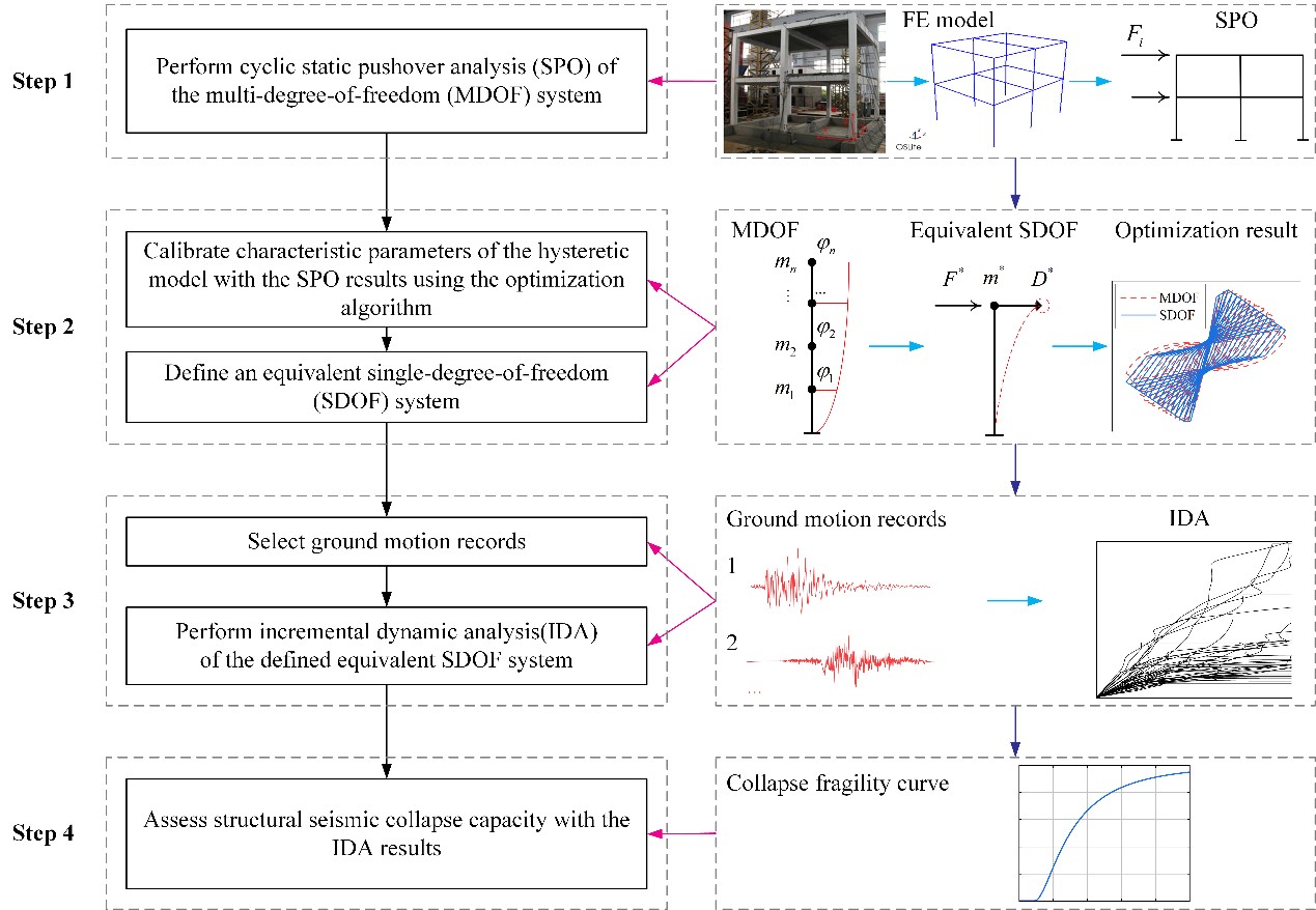 提出了一種結(jié)構(gòu)抗倒塌能力高效評估方法(圖1)。該方法主要包括以下四個步驟:首先對多自由度結(jié)構(gòu)建立有限元模型進行靜力往復(fù)推覆分析并得到其等效單自由度體系;其次采用優(yōu)化算法校準(zhǔn)單自由度體系骨架曲線和滯回特征參數(shù);然后對等效單自由度體系進行增量動力分析;最后得到結(jié)構(gòu)倒塌易損性曲線并評估結(jié)構(gòu)抗倒塌能力。分別對RC純框架結(jié)構(gòu)、鋼框架結(jié)構(gòu)和RC填充墻框架結(jié)構(gòu)進行抗倒塌能力評估,并與傳統(tǒng)抗倒塌能力評估方法計算結(jié)果對比,驗證和表明了本文所提方法的有效性和高效性。