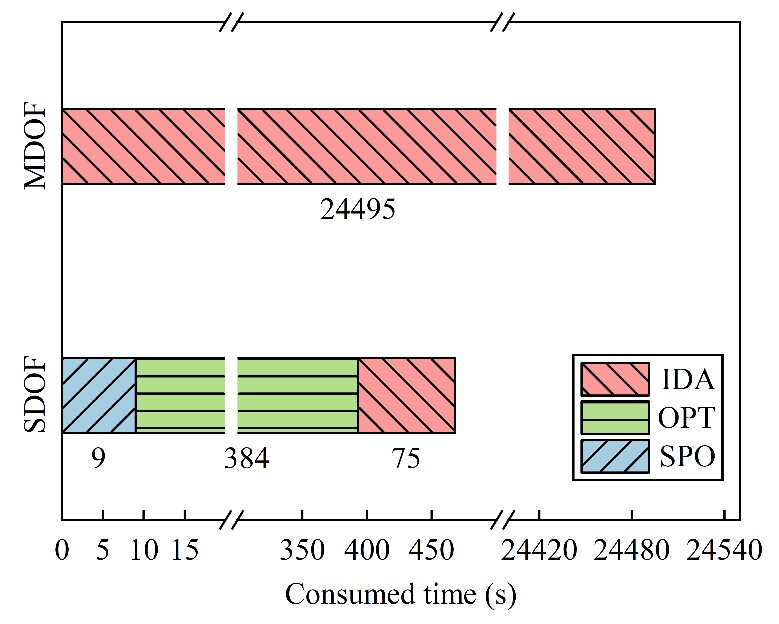 (3)相較于傳統(tǒng)直接采用多自由度有限元模型抗倒塌能力評估方法,采用本文所提等效單自由度方法進行抗倒塌能力評估,所需計算時間僅為傳統(tǒng)方法的2%(圖6),大幅度提升了評估計算效率。另外,本文所提方法不僅適用于單體結(jié)構(gòu),也可以推廣至城市尺度的群體結(jié)構(gòu)抗倒塌能力評估。