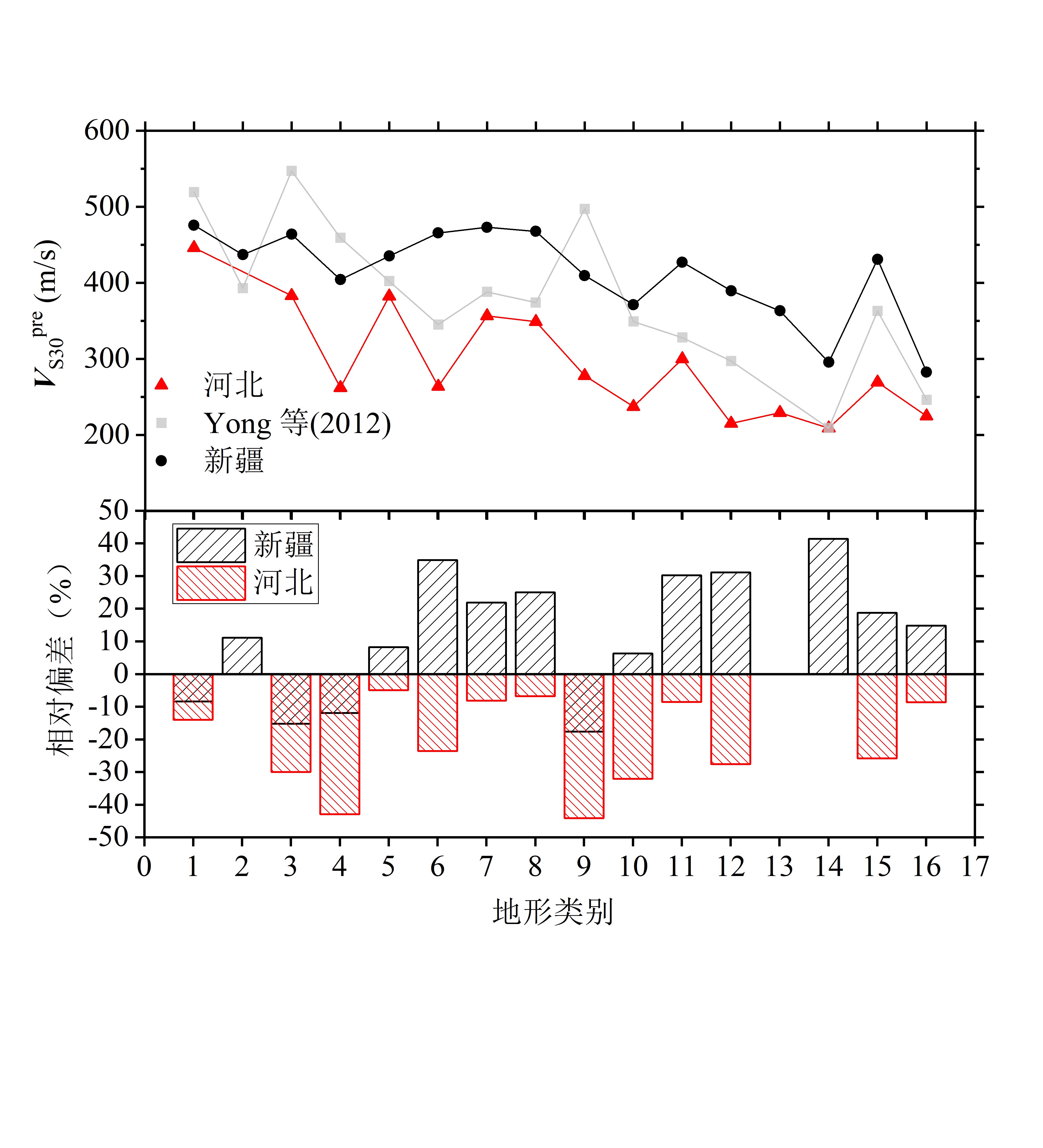 圖2 新疆與河北地區(qū)16個地形類別的VS30最佳預(yù)測值及與Yong等(2012)結(jié)果的比較
