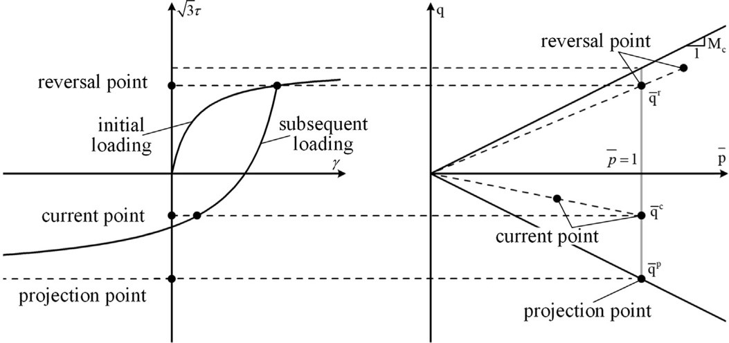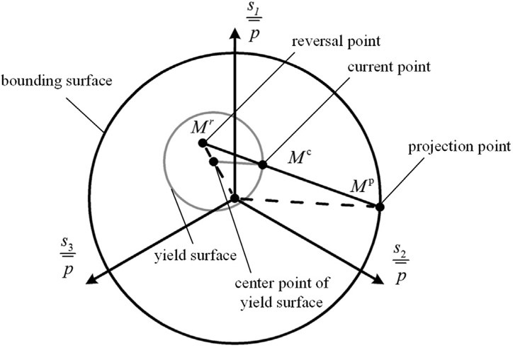 1.本文首先提出了一個便于工程應(yīng)用的三維土體彈塑性本構(gòu)模型。本模型基于邊界面模型理論,在歸一化偏平面中建立投影法則給出應(yīng)力狀態(tài)參量(見圖1);采用土體材料模量與圍壓的經(jīng)驗關(guān)系描述圍壓改變引起的土體模量變化;并根據(jù)偏應(yīng)力不變量建立應(yīng)力等效關(guān)系,將一維Pyke模型拓展到三維應(yīng)力空間并以此推導(dǎo)塑形模量(見圖2)。