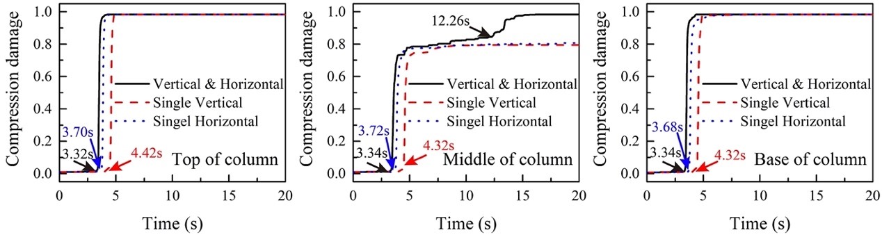 2.本文依據(jù)大開車站的震害調(diào)查資料,建立三維非線性有限元模型(見圖3),采用時域動力顯式有限元分析方法重現(xiàn)了大開車站在雙向地震動共同作用下的坍塌過程及其“M”型破壞模式(見圖4),給出了中柱混凝土實效演化過程(見圖5)。