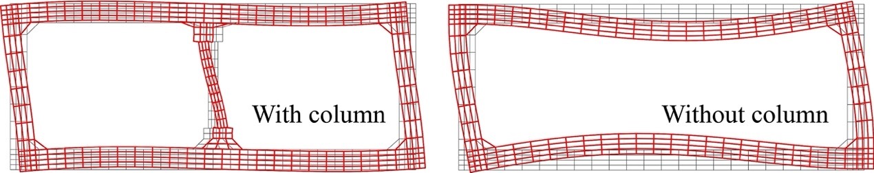 3.根據(jù)數(shù)值模擬得到的結(jié)構(gòu)變形演化過程(見圖6),可以將大開車站的破壞分為三個階段:I)中柱在水平和豎向地震動共同作用下失效;II)中柱承擔(dān)的上覆土和后續(xù)地震荷載向頂板轉(zhuǎn)移,并引起頂板混凝土損傷發(fā)育;III)頂板破壞沉降引起結(jié)構(gòu)整體垮塌。通過對比有無中柱截面的地震變形模式(見圖7),可知結(jié)構(gòu)幾何形狀(頂板和側(cè)壁的剛度比)對地下結(jié)構(gòu)的地震響應(yīng)有很大的影響;頂板的剛度大于側(cè)墻的剛度,有利于地下結(jié)構(gòu)的抗震。