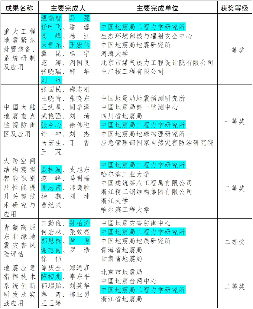 發布時間: 2025-07-17 點擊數量:5490近日,中國地震局公布了2025年度防震減災科研成果獎評選結果,我所作為牽頭單位完成的成果獲一等獎1項、二等獎1項,作為參與單位獲一等獎1項、二等獎2項。